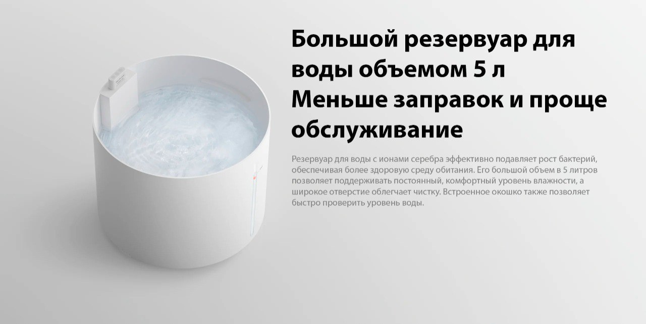 Модель оснащена гигростатом и поддерживает автоматический и ручной режимы работы. Доступно сенсорное и электронное управление, а также контроль через приложение Mi Home и голосового помощника. Есть таймер, регулировка скорости вентилятора и автоматическое отключение при отсутствии воды.